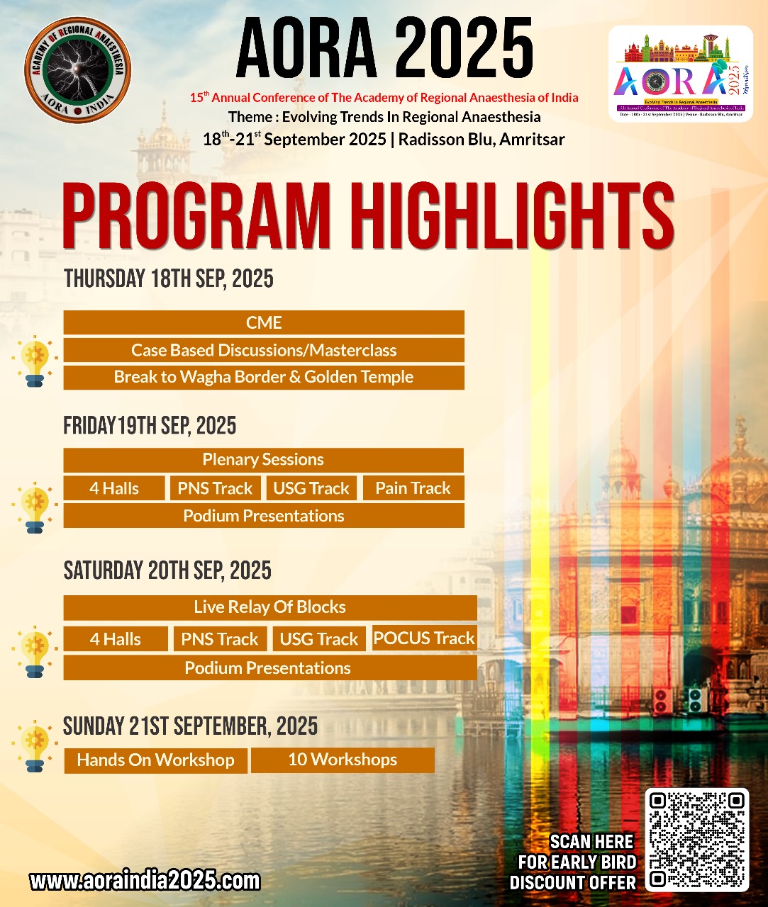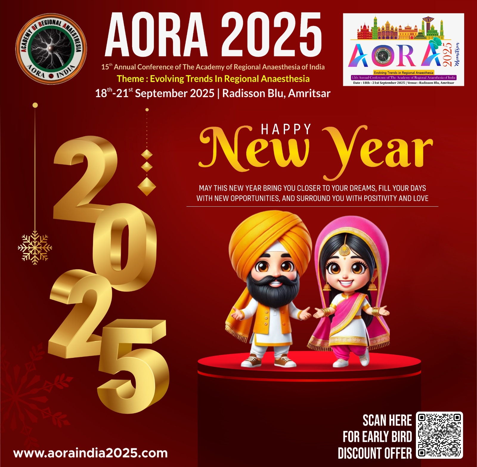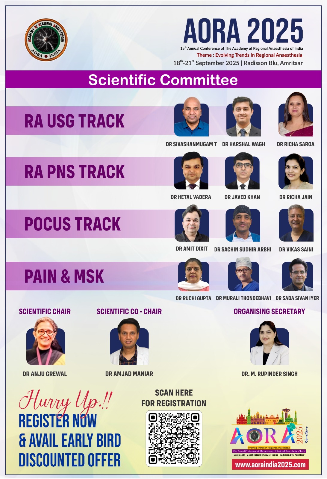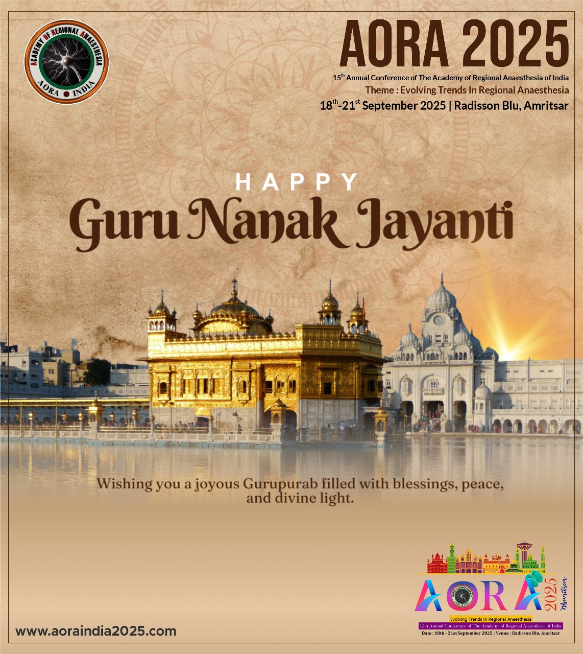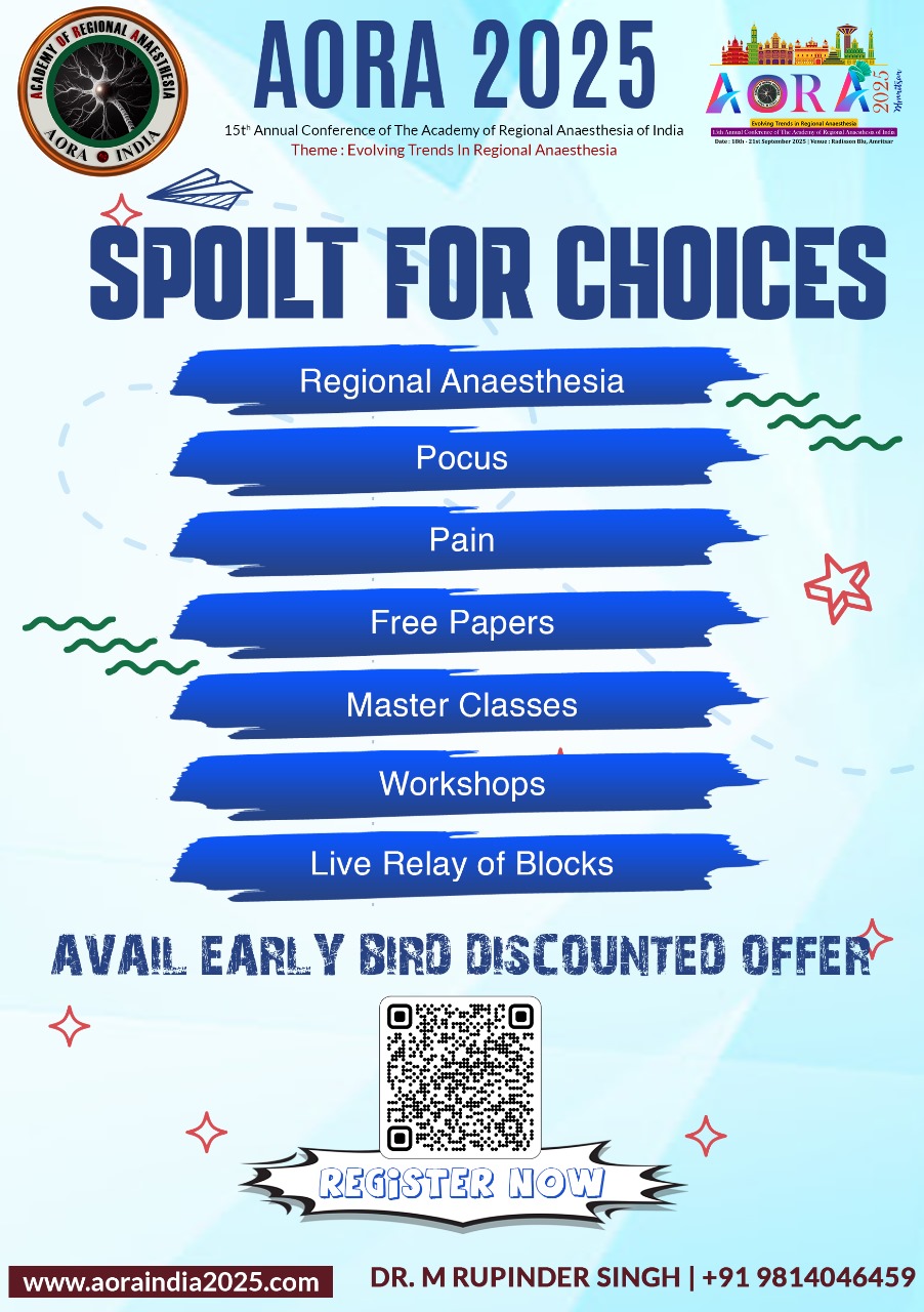 On behalf of the organizing committee, it is our great pleasure to extend a warm welcome for the 15th Annual Conference of The Academy of Regional Anaesthesia of India (AORA 2025), scheduled from 18th – 21st September 2025 at Radisson Blu, Amritsar. As we prepare to gather for this prestigious event, scheduled to take place in the heart of Amritsar, we are excited to bring together distinguished researchers, practitioners, and experts from around the globe to explore and discuss the latest advancements and innovations in the field of Anaesthesia. This conference promises to be a stimulating opportunity for knowledge exchange, networking, and collaboration.