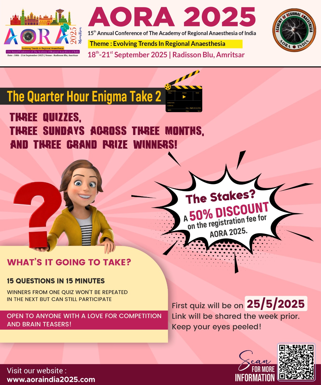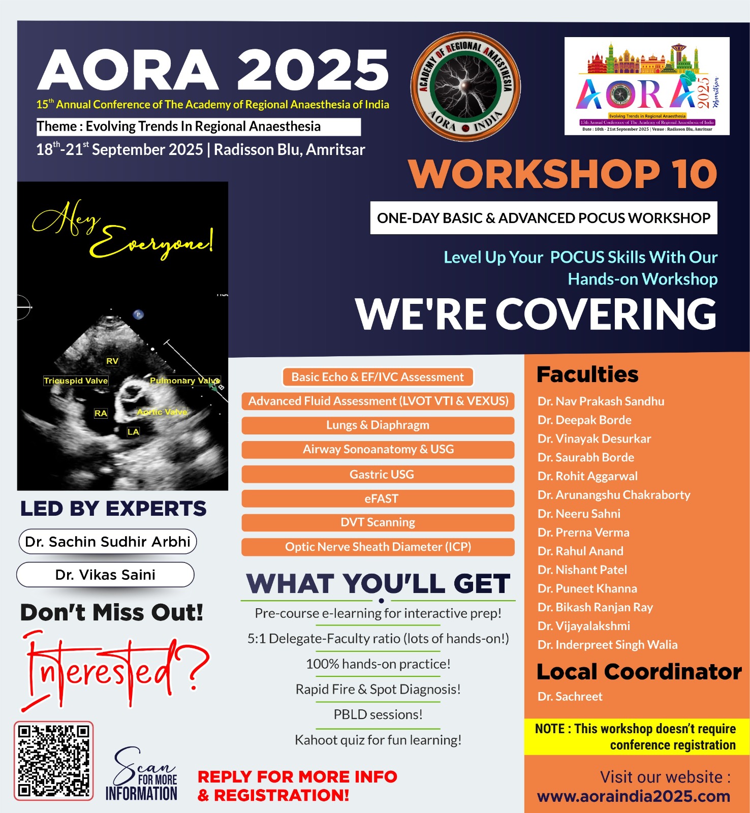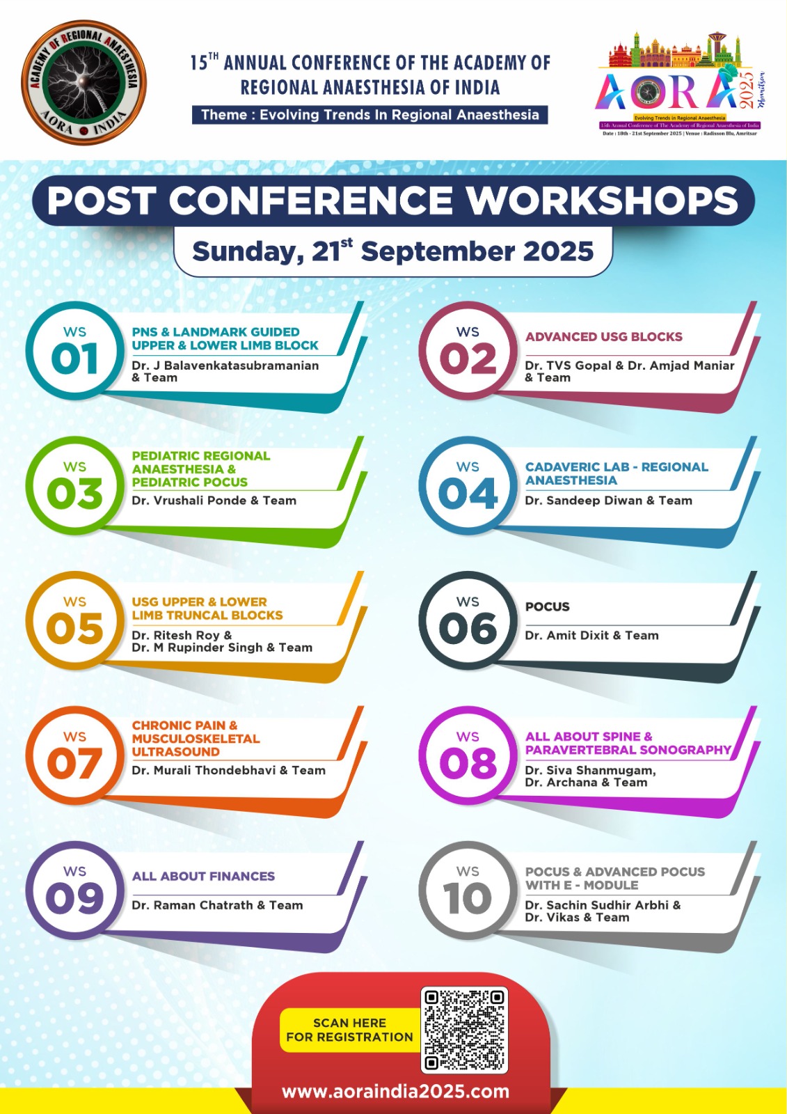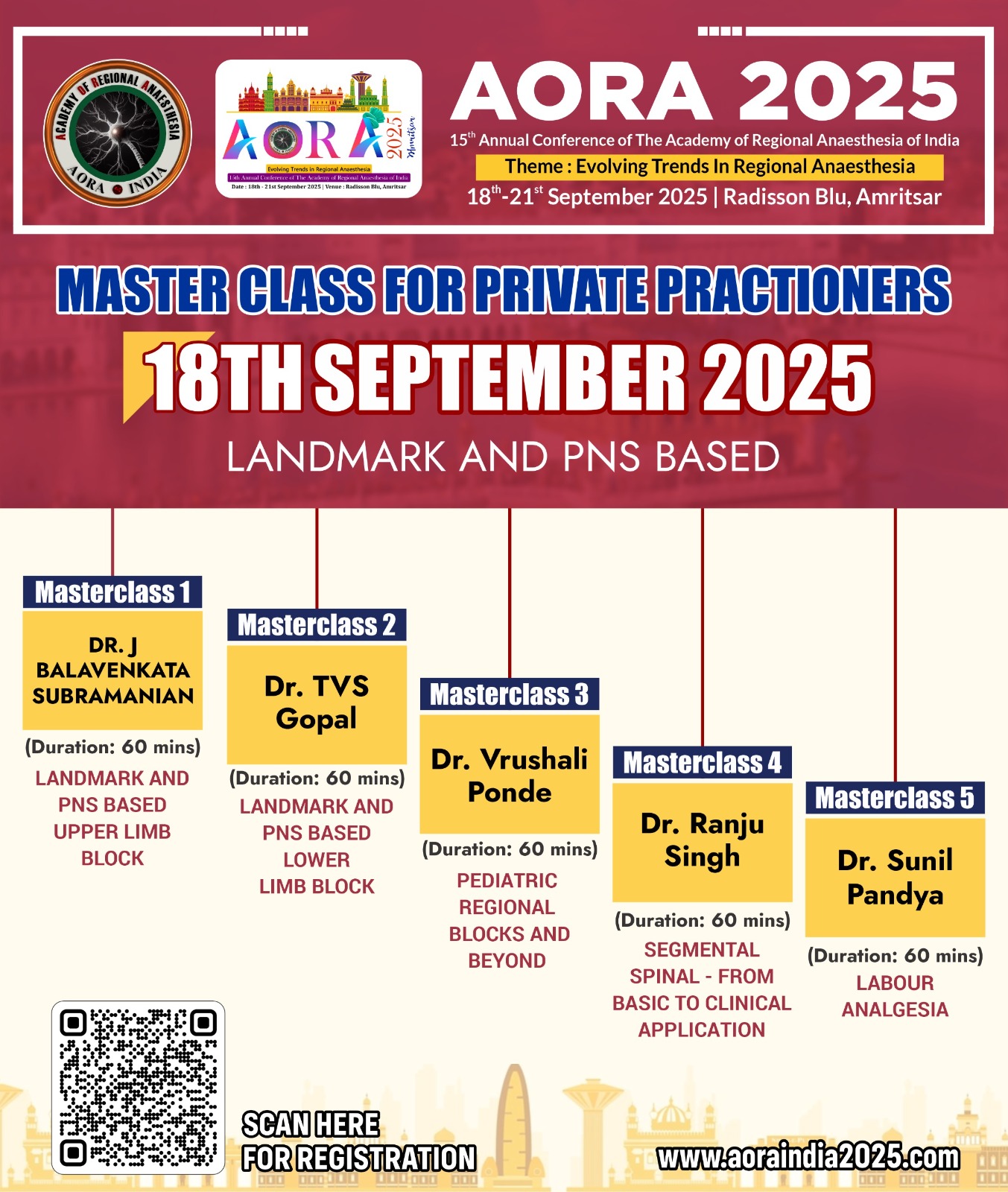On behalf of the organizing committee, it is our great pleasure to extend a warm welcome for the 15th Annual Conference of The Academy of Regional Anaesthesia of India (AORA 2025), scheduled from 18th – 21st September 2025 at Radisson Blu, Amritsar. As we prepare to gather for this prestigious event, scheduled to take place in the heart of Amritsar, we are excited to bring together distinguished researchers, practitioners, and experts from around the globe to explore and discuss the latest advancements and innovations in the field of Anaesthesia. This conference promises to be a stimulating opportunity for knowledge exchange, networking, and collaboration.